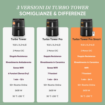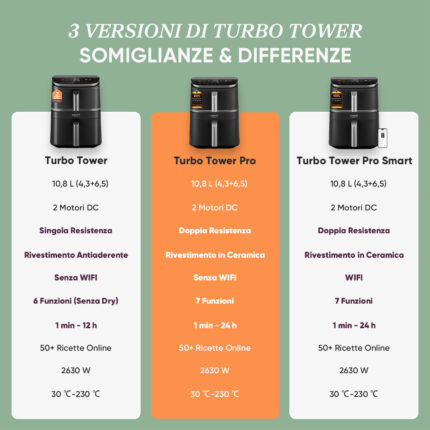 Cosori dispone di diversi modelli progettati con la tecnologia più avanzate per offrire sempre risultati di qualità e di alto livello. Le friggitrici ad aria Cosori si adattano ad ogni utente, in base alle sue esigenze e ai suoi gusti. Consulta il nostro catalogo e scegli la friggitrice ad aria più adatta alle tue esigenze in base al prezzo, alla capacità, agli accessori e alle caratteristiche extra, ecc.