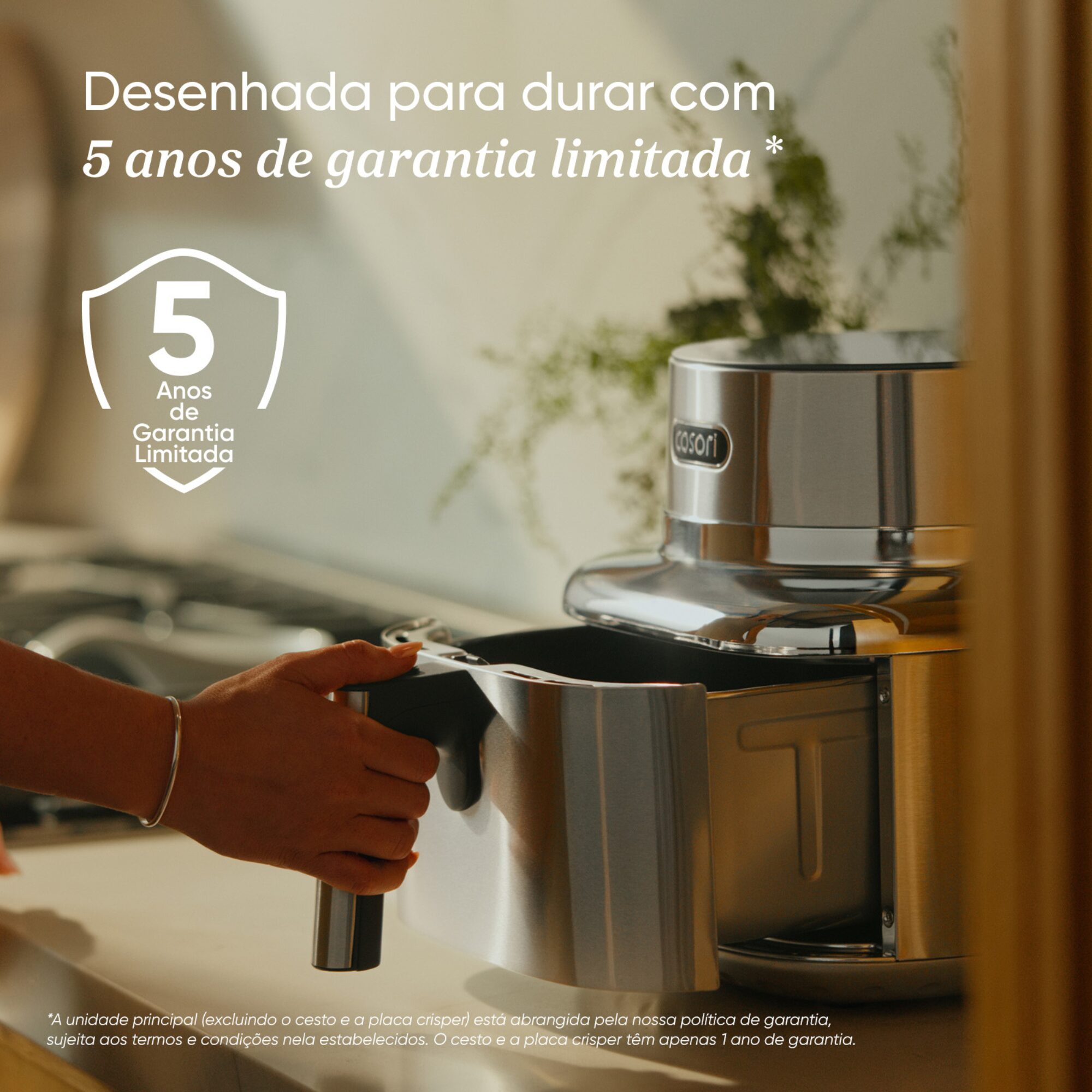 A COSORI ICONIC SINGLE foi concebida para durar. Por isso, tem uma garantia limitada de 5 anos na unidade principal, refletindo a qualidade dos seus materiais e a sua engenharia de alto nível. Mais do que uma fritadeira de ar quente, é um investimento em tranquilidade, desempenho e confiança dia após dia. Porque quando um produto é bem feito, nota-se... e é garantido.